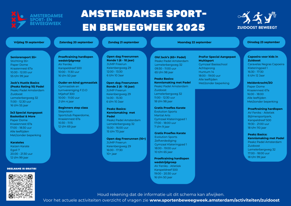 Vandaag is de Amsterdamse Sport- en Beweegweek officieel van start gegaan. Van 19 tot en met 28 september 2025 kunnen mensen in Amsterdam gratis deelnemen aan verschillende sport- en beweegactiviteiten. Meer dan honderd sport- en beweegaanbieders openen hun deuren en nodigen iedereen uit om mee te doen. Dit is het moment om nieuwe sporten te ontdekken, kennis te […]