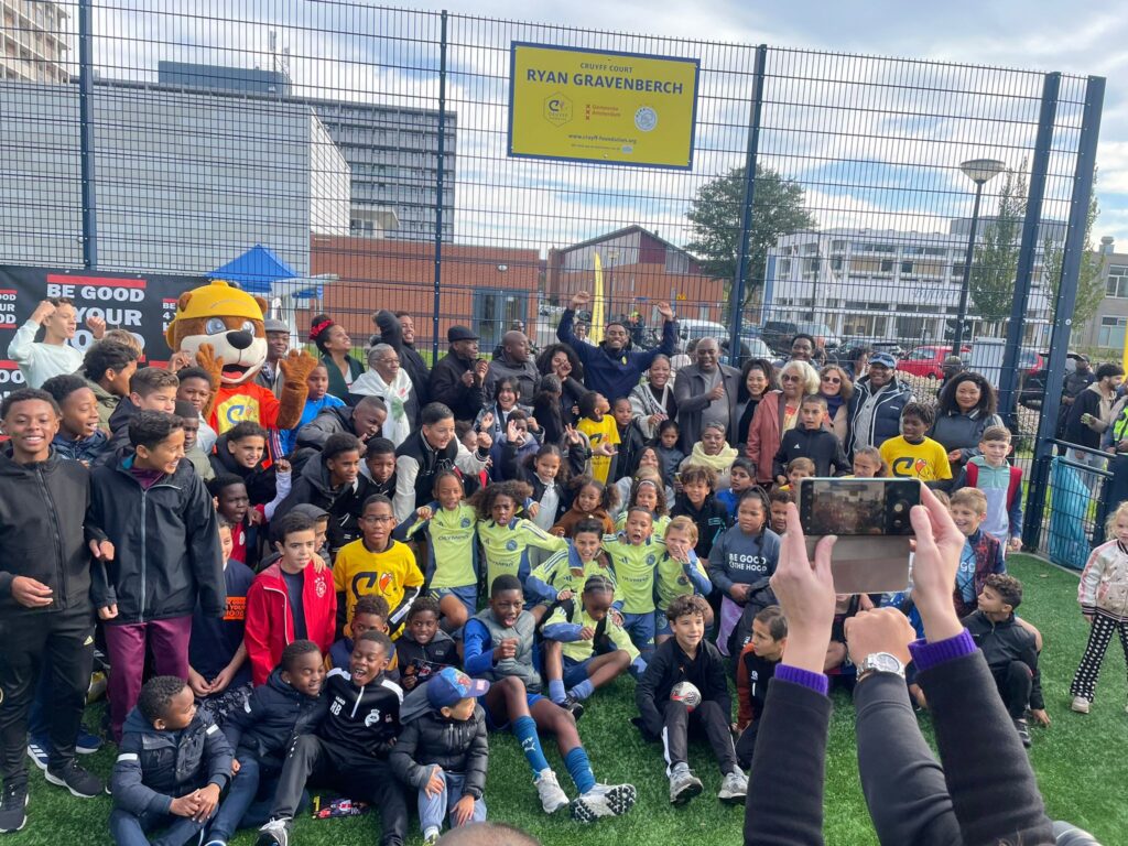 Afgelopen week is op Egoli (E-buurt), bij het gelijknamige scholencomplex, het Cruyff Court Ryan Gravenberch geopend. Vanwege de interlandwedstrijd kon de sterspeler aanwezig zijn om het naar hem vernoemde Court te (her-)openen. Ryan, opgegroeid in Zuidoost, was met familie en vrienden aanwezig. Naast hen waren vele toekomstige gebruikers van het Cruyff Court verzameld en na de opening werd ook een wedstrijd gespeeld.