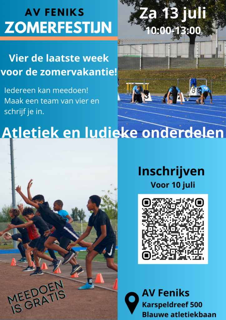AV Feniks organiseert op zaterdag 13 juli van 10:00-13:00 het Zomerfestijn! Meedoen kan als team van vier (waarvan twee geboren in 2013 of later), maar ook kun je meedoen als je nog geen volledig team hebt. Iedereen is van harte welkom om mee te doen! Inschrijven kan t/m 10 juli via: https://forms.gle/xAyNU2CjH4JLWim48